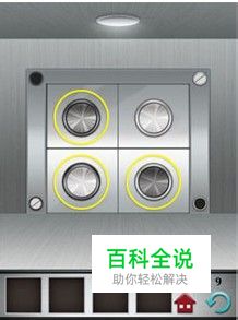 第九关看起来像一个保险柜,电梯门上有四个旋钮,而门四个角的螺栓给解答这一关做了提示。 1号门板对应的是左上角的螺栓,内圆和外环都更改为暗色。 2号门板是对应右上角的螺栓,内圆和外环都更改为亮色。 3号门板是对应的左下角的螺栓,内圆更改为亮色,外环更换为暗色。 4号门板对应的是右下角的螺栓,内圆更改为暗色,外环更改为亮色。 设置完成后,电梯门就会自动打开。