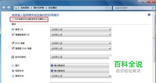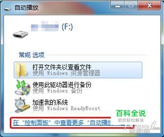我们可以先禁用“自动播放”,就是在上图中选择“在‘控制面板’中查看更多‘自动播放’选项”。 然后取消勾选“为所有媒体和设备使用自动播放”。 但是我们如何打开这个U盘呢?直接在“计算机”里双击打开?那可就白禁用了。 说我们想进入的U盘的盘符为(F:),那么我们可以直接在地址栏输入“F: ”(这里的字母和冒号均为英文状态下的半角字符),敲击Enter,就进去了。这样做主要是中断对路径的相对关系的记录,可以从一定程度上杜绝病毒的传播。