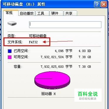 首先,鼠标右键单击U盘盘符,打开属性窗口,查看你的U盘格式是哪个,如果不是NTFS格式,请将U盘格式改成NTFS。我的U盘是FAT32,如图: