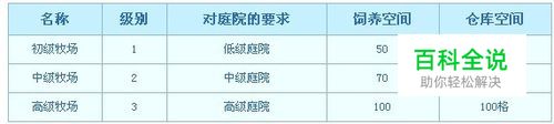 牧场规模 牧场分有不同的规模,不同规模牧场可饲养禽畜的数量和仓库的储存量都不同。最初建的牧场规模为最小,可以通过饲养禽畜累计饲养经验来扩充牧场的规模。牧场一共分为三个级别。