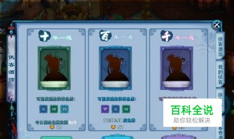 侠客的获取 玩家达到指定等级后,会解锁侠客功能,打开游戏界面右下角的十字按键,可以看到侠客按钮,点击进入就可以看到侠客酒馆了。侠客的获取途径主要是通过侠客酒馆寻访。寻访分为三种,十年一遇,百年一遇和千年一遇。十年一遇可寻访到的侠客品质为白、绿、蓝,百年一遇为绿、蓝、紫,千年一遇为蓝紫。其中千年一遇寻访到紫侠客的几率最高,最低寻访到的侠客品质都是蓝色的,非常给力。三个不同的酒馆系统均会赠送一定的免费抽取次数,十年一遇为每天5次,百年一遇每24小时一次,千年一遇为48小时一次。