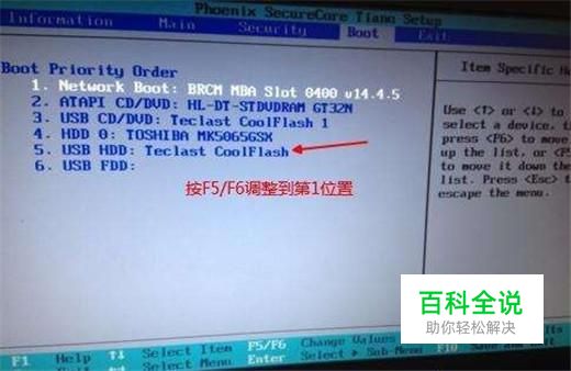 然后在这一栏下,我们将“USB DVD”一栏移动到第一栏,然后保存设置之后,重启一下电脑。