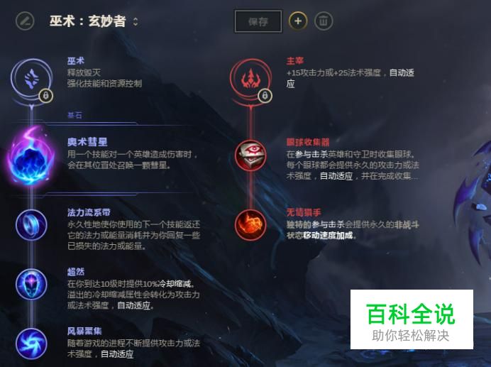 英雄联盟经过改版之后,符文天赋已经融合为了一体,所以并不能像以前那样佩戴了,佐伊的话推荐符文选择玄妙者,这套符文也是默认的一套符文,为什么选择这套呢?因为佐伊前期伤害是很低的,而且就算到了六级后,她的大招也是没有伤害的,所以选择这套伤害最高的符文,是最划算的。