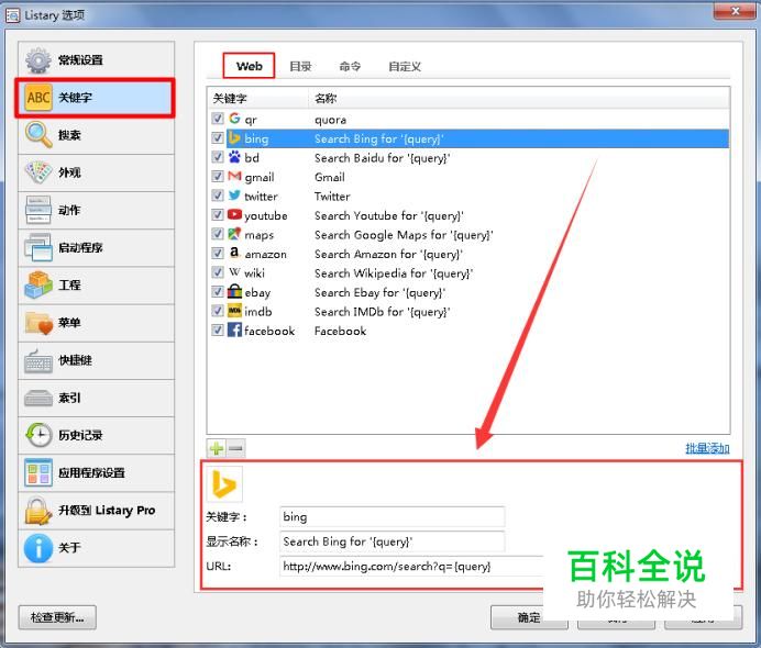 点开"关键字"选项: 进入listary选项界面后,点开左侧的"关键字"选项,在右侧web文本框里会有一些listary预设好的web网页。随意点开一个网页,可以看到包括"关键字"、"显示名称"和"URL"三要素。前面两个比较简单,URL稍复杂些,先仔细揣摩一下范例的URL是怎样设置的。