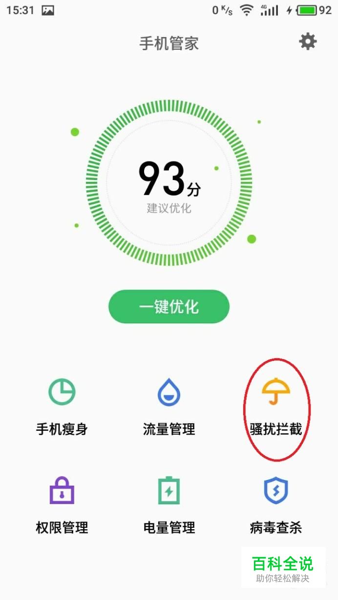 进入手机管家后在界面中找到“骚扰拦截”图标,点击并打开它。