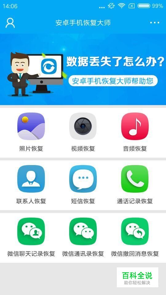 打开安卓手机恢复大师软件,在界面上直接选择“照片恢复”图标,点击进入,软件便开始扫描手机上的数据。