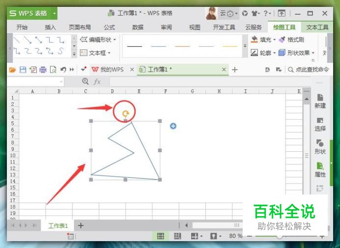 进入表格主界面后,在单元格内插入一个简单的图像形状,首先鼠标左键单击该图形,我们知道通过图形上的旋转图标可以实现图形的旋转,这里为大家介绍另外一种方法,如下图所示: