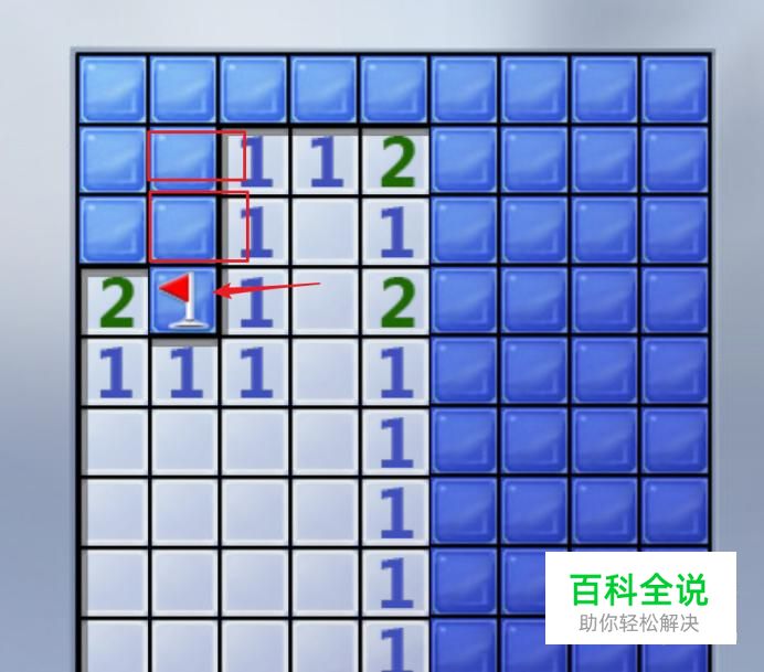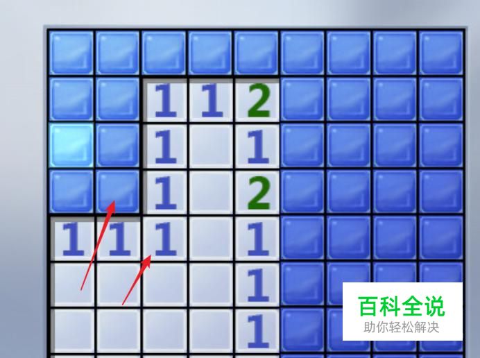 这种三个1连着的,最下方的肯定有且只有一个是雷,那上方箭头指示的那个方块肯定不是雷了。