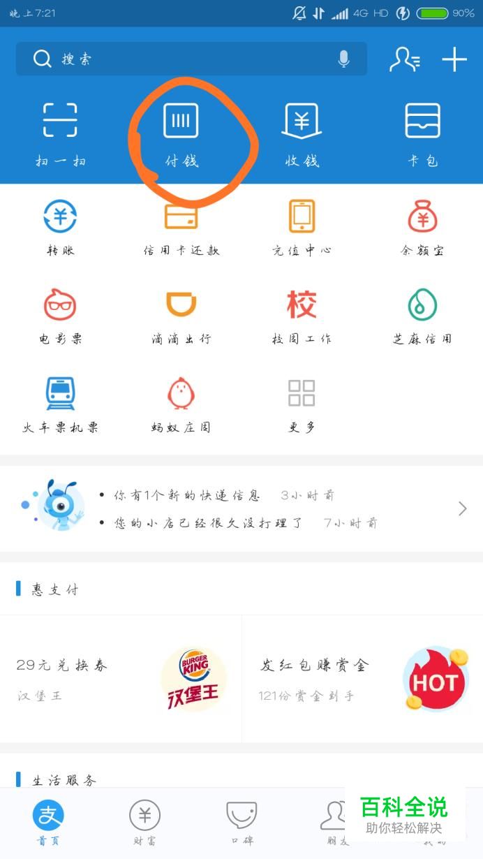 点开支付宝首页,如果你要付款就点击付钱,会出现一个付款码(由于不能截屏就没有图示),让商家扫描就可以完成付款了