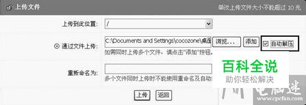 解压ZIP文件 如果面临ZIP文件解压缩问题,且单个压缩包体积在10MB以下的,网易网盘也可以帮你解决。点击“上传文件”按钮,打开上传页面(如图2),选择上传目录,然后点击“浏览”按钮添加需要上传文件路径,勾选“自动解压”复选框,点击“上传”按钮,系统将上传并解压文件放入指定目录xp系统下载。现在,将已解压的文件下载即可。 图2 注意:如需解压多个压缩文件,每次只能上传一个压缩包,否则“自动解压”选项,将不可用。