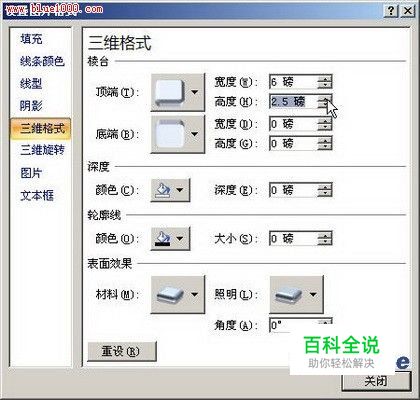 第2步,在“图片工具”功能区的“格式”选项卡中,单击“图片样式”分组中的“图片效果”按钮,选择“棱台”选项,并在打开的棱台效果列表中选择合适的图片棱台效果,如图所示。 小提示:如果需要取消选中图片的棱台效果,可以在棱台效果列表中选择“无棱台效果”选项。如果需要对棱台效果进行更细致的设置,可以在棱台效果列表中选择“三维选项”命令,如图所示。 打开“设置图片格式”对话框,在“三维格式”选项卡中对棱台顶端和底端的宽度和高度进行设置,设置完毕单击“确定”按钮,如图所示。