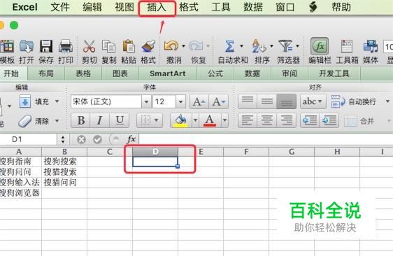 点击选中D1单元格,点击菜单栏上的‘插入’,