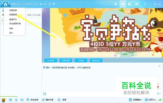 首先我们点击YY工会面板上面的房间图标,然后选择频道管理