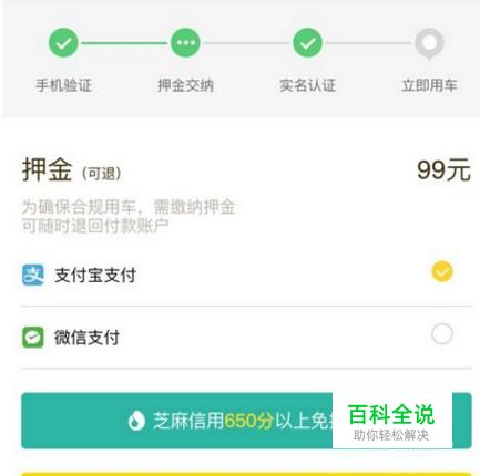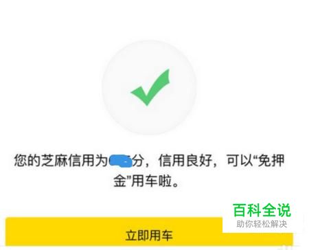 点击下方的芝麻分650以上免押金,然后会弹出页面,如果芝麻分够的话就能立即用车。