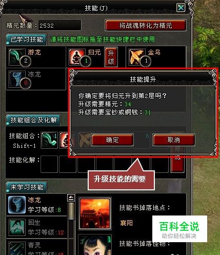 点击“升级”按钮后,会弹出技能提升需求对话框,点击“确定”后,技能升级到下一等级;需要有足够的精元与宝钞(铜钱)才可进行升级;