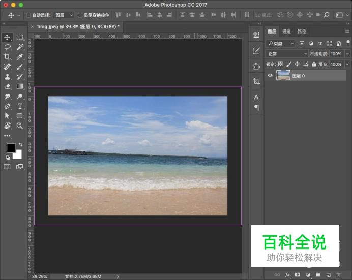 打开PS软件,准备需要处理的图片拖入PS中打开,如下图,我们可以看到水平线基本往下线偏斜,需要进行修正。