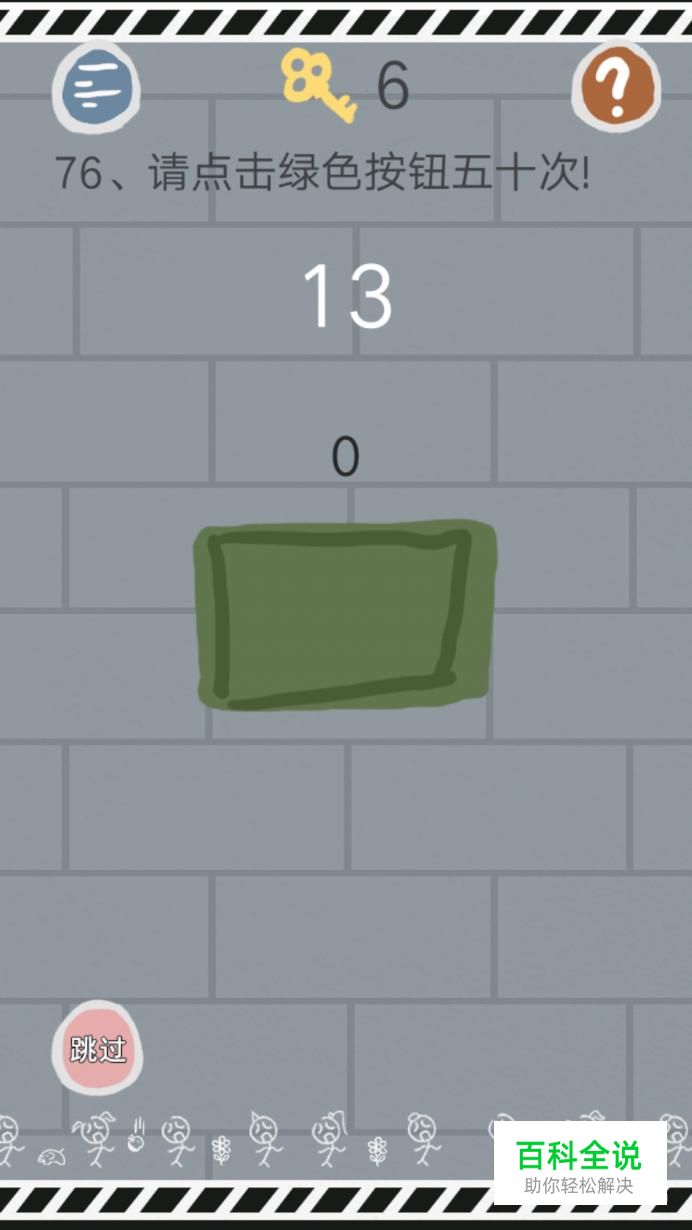 第76和77关。 76.点击绿色按钮50次。那我们就点击50次吧,不过玩家们要小心哦,中途会出现红色,红色不要点,等红色变绿了再点。 77.这一关很上一关一样呢,也是点击绿色按钮50次,不过这次计数器有问题,玩家们只需要点击49次就OK了。