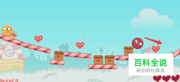 最后才是点击打碎主角旁边的小饼干,让其滚动下来,收集到另两颗红心,并与‘饼干酱’触碰,顺利收集到三红心过关。