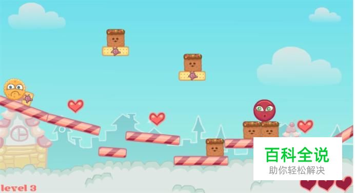 你可能会以为,当主角滚动下来和‘饼干酱’碰到一起的时候,会有惯性,让其滚动到第三颗心的位置,以便收集到最后一颗红心。 但在这款游戏里,主角和酱一碰到一起,就通关了,不会按惯性再滚动的。