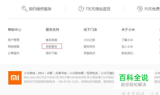 来到小米官网页面后,一直拉到最底,找到“服务支持”,点击“自助服务”。