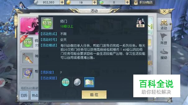 师门: 当玩家达到10级后就可以领取师门任务,完成师门任务后可以获得经验以及银币奖励,并且可以获得2点活跃度。