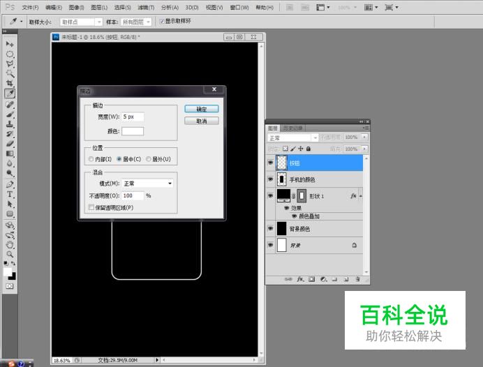 用同样的方法,新建图层,绘制一个“home键”,也是用白色描边,但是这里描边像素设置为5,因为它不是手机的轮廓,因此描边不能那么粗。