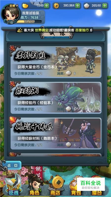 进入试练界面,我们选择“塞外剿匪”,这个副本是金币本,通关可获得大量金币,每日可参加2次。