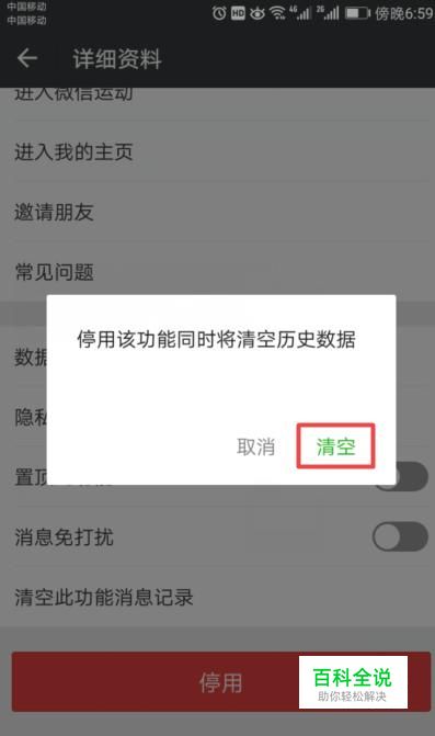 弹出的界面,我们点击清空,这样就关闭步数了,同时也取消了微信运动的关注。
