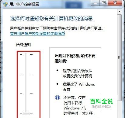 选择“更改UAC设置”,并点击启动。将出现如下界面。如图: