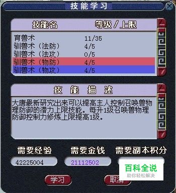 育兽术的实用性也很高。如果在战斗中,召唤兽总是逃跑,我相信当时的你一定很无奈。大于或等于120级的玩家可以在副本官员那里学习育兽术,同样是需要花费一定的经验,金钱和副本积分。(这个无论是经验,金钱还是副本积分,并不需要太高的开销)浅浅把育兽术点到了11级,浅浅个人觉得很实用,无论是PK还是杀生死劫,宝宝逃跑的几率大大减少了 (从图上大家可以看到,育兽术对钱的消耗并不大,波动也不大,比较容易让人接受) 浅浅最后要说的就是管理召唤兽修炼点数了,现在有很多玩家跑完BB环后换修炼果去卖。
