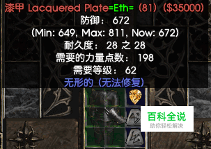 ETH BUG(这是重点!) 暗黑2之中存在一个BUG,就是给透明防具打孔后,透明防具的防御力会莫名其妙增加很多(事实上是增加了最大可能防御的一半),而拉苏克任务没有这个能力。这被称为ETH BUG。正因为有如此效应,可以打孔的透明防具一般不去找拉苏克。
