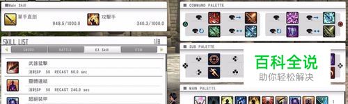 技能配置盘 将习得的技能放置快捷栏中,方便战斗时使用。分别分为△键和○键的快捷键、副配置盘以及主配置盘。 △和○键的快捷键有四种使用方法,分为不推动摇杆使用,推动左摇杆使用,左摇杆转一圈使用以及推两下左摇杆使用,推动摇杆不限方向。○键默认为格挡。 副配置盘默认为指令系统,其中L+方向键上为锁定目标,L+方向键下为回复、L+方向键左为指挥队友回避、L+方向键右为一起施放剑技、L+△为进行连携攻击、L+□为帮忙吸引仇恨、L+×为切换、L+○为good(与R2相同)。 主配置盘可以将任何需要的剑技、战斗技能、道具、指令放入其中,怎么方便怎么来。在战斗中按触控板右侧打开主配置盘,通过十字键选择技能,然后按圈使用。