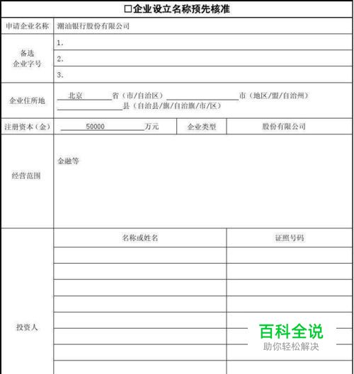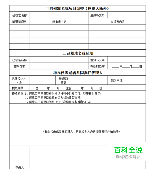公司注册流程——核名 第一页: 核名(该表以当地工商局为准):首先准备3-4个名称,填写好企业住所地(房屋合同上的地址,如果是租赁填写租赁合同上的地址),填写注册资本金,企业类型写:有限责任公司。 经营范围:经营范围填写需要非常规范,有固定的词语和书写形式,建议先在网络上查询经营范围相关的专业词语,然后到当地工商局咨询工作人员后填写,一处填错,表格就要重新填写,这一块一定要慎重。 投资人及证件号码:这部分的填写要完全按照身份证原件上的信息写。 第二页 指定代表或共同委托代理人:如果找人帮忙注册公司,代理人需要填写这部分内容,权限按照实际情况选择同意或不同意。其余按照表格填写即可,最后要粘贴身份证复印件。 申请人签字和盖章:这一项要法人和股东都签字盖章(或按手印)