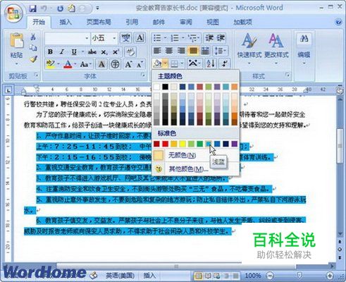 第2步,在“开始”功能区的“段落”分组中单击“底纹”下拉三角按钮,在打开的底纹颜色面板中选择合适的颜色即可,如图所示。