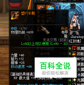 盟约长靴,90级传说布甲鞋。每2000点MP增加2%的力量和智力,最多开增加10%,能穿的上这件装备的人可以触发最大增幅,作为90级传说它只算一件合格强散,但是一看鞋部位的其它装备,它就是一个强力强散了。