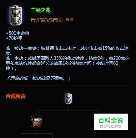 兰顿之兆,价格2850金币 这件装备基本上是所有坦克和半肉型英雄的首选,也是对手ADC装备未完全成型时对其限制最大的装备。 这件装备提供的血量和护甲就价值2733金币(根据基础装备价格计算),这一点看上去平淡无奇。但是它有一个减少攻击者15%攻速的效果,我们知道LOL中攻速增加是基于基础攻速,而攻速减少是基于面板攻速的,而面板攻速一般至少是基础攻速的2倍,所以对于ADC来说,15%的攻速降低意味着少了一件增加30%攻速的装备,仅这一点价值就有900金币,并且因为它能减少每一个攻击者的攻速,所以每多一个敌人攻击,出蓝盾的收益就增加900金币;蓝盾还有一个群体减移速的主动效果,在团战中的作用绝对不可小觑。 综合来说这件装备真实价值超过4000金币,在面对AD伤害尤其是普攻伤害时效果明显,而且提供的血量也能一定程度上承受一些AP伤害,是一件非常全面的装备 装备缺点:价格高昂。
