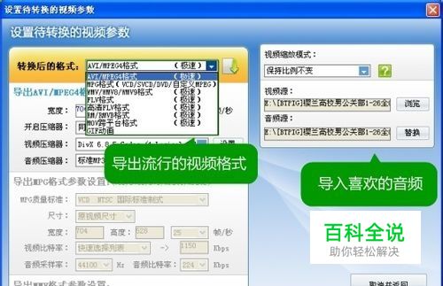 把视频声音去掉,为视频添加自己喜欢的音乐 接着导入视频后,进入“设置待转换的视频参数”对话框,我们就可以去掉视频的声音,并为视频加音乐了。点击右栏目“音频源”处的“替换”按钮,替换成自己喜欢的音乐,非常简单。在“转换后的格式”下拉框中,选择想要导出的AVI,FLV,MPG,RMVB,WMV等流行的视频。视频的宽高、比特率、编解码器设置同样可以在该对话框进行,非常齐全。