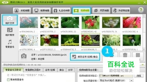 将自己的相片导入到软件里面。 如下图所示,我们选择“视频相册”,点击标签1-“添加相片”按钮就可以将相片导入了。软件支持将制作好的视频文件保存为AVI/DVD/VCD/SVCD格式,最高支持导出1080P的全高清视频,在高清电视上也能观看自己制作的视频。 我们点击“修改名字/注释/旁白”按钮可以给自己的相片添加上注释/旁白,如下图所示,我们先选中需要修改的相片,然后在下图下方的蓝色选框处进行添加内容就行了,将自己想表达的心情写入到视频里面,让视频更富感情色彩~
