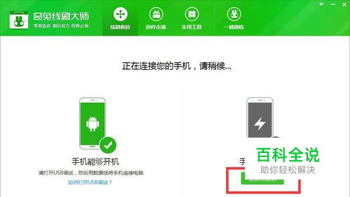 连接手机。[能开机的打开USB调试即可连接。如果不能开机,进入自己机型的线刷模式再连接电脑。](若电脑提示连接异常或不停闪跳,请检查驱动和数据线或端口问题)。