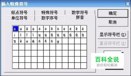 在Word中,汉语拼音的音调是被当作特殊符号来看待的。点击插入→特殊符号,再点击拼音,打开插入特殊符号的拼音项对话框;然后在对话框中选择相应音调的拼音字母,点击确定,就输入音调了;如下图所示。