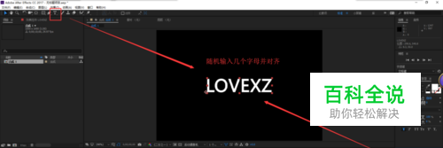 选择文本工具,在新建的合成1上随意输入几个英文字母,调整好英文字母的大小等属性,并在对齐面板中执行水平中齐与垂直中齐,将字母处于合成1的中间位置。