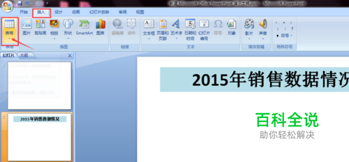 首先在需要插入Excel电子表格的幻灯片中,把属性栏切换到插入选项,选择表格组中的表格按钮。