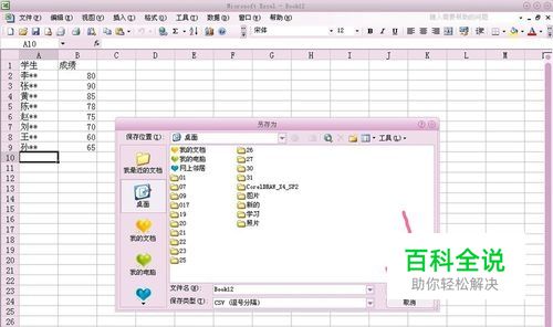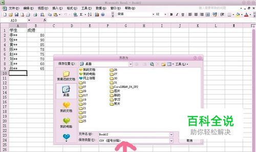 首先是打开Excel 2003,输入信息,然后,点击菜单栏上的“文件”,在下拉选项中选中“另存为”,随即弹出一个“另存为”对话框,在“保存类型”下拉选项中选择“CSV逗号分隔”,再更改文件名字,如图所示。