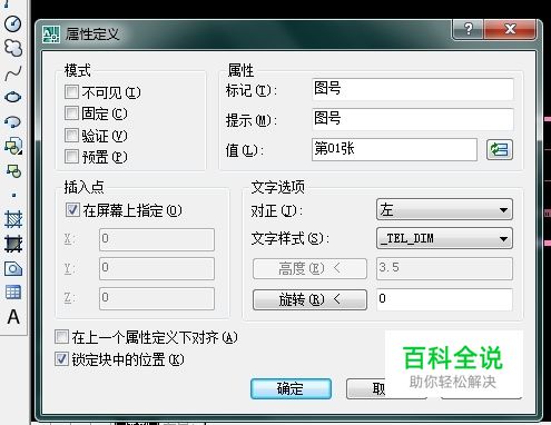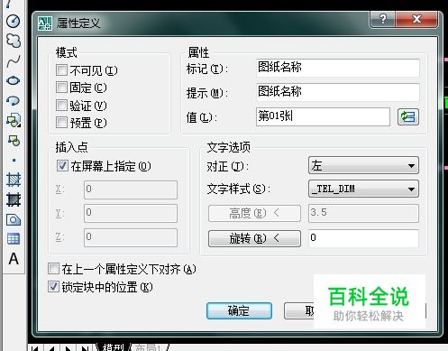 在属性栏修改标记:图纸名称,提示:图纸名称,值:第01张,将“图纸名称”插在修改图纸名称处