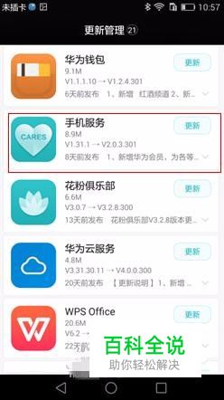 方法②:打开应用市场,点击“管理”中的“更新管理”,找到“手机服务”应用,点击更新即可。