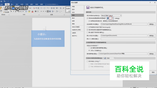 选择“选项”,点击“保存”,勾选“保存自动恢复信息时间间隔”。