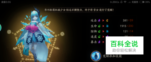 最后这样就觉醒成功啦,攻击、生命、防御、速度,暴击都有显示增加,觉醒添加功能:皮肤功能开启。