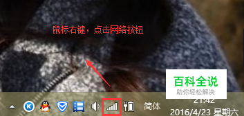 第一步,找到电脑桌面右下角,像手机信号的网络小图标,鼠标右键点击,选择打开网络和共享中心,如下图所示。