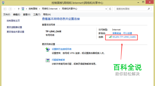 第二步,在网络和共享中心窗口中找到 连接:WLAN(wifi名字),点击它,如下图所示。