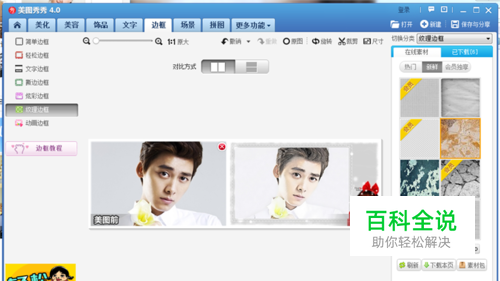 9、还是在“美容”选项下,选择“睫毛膏”,对照片中的眼睛和眉毛进行来回的图画,这样可以是眼睛和眉毛看起来更有线条。10、你也可以对处理好的照片加一个边框。